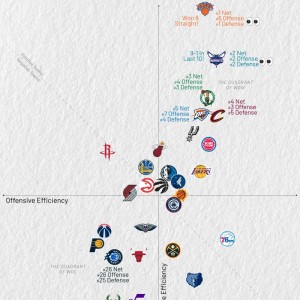 虎扑02月06日讯 美记Kirk Goldsberry制图晒出近10场联盟攻防效率图。尼克斯净效率值第一,进攻效率第六、...