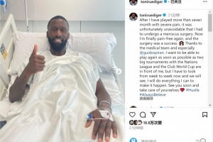 吕迪格社媒晒出自己躺在病床上竖大拇指的照片,并写道:“在忍受严重疼痛踢了7个多月比赛之后,我不得不接受半月板手术,很遗憾这是无法避免的。”