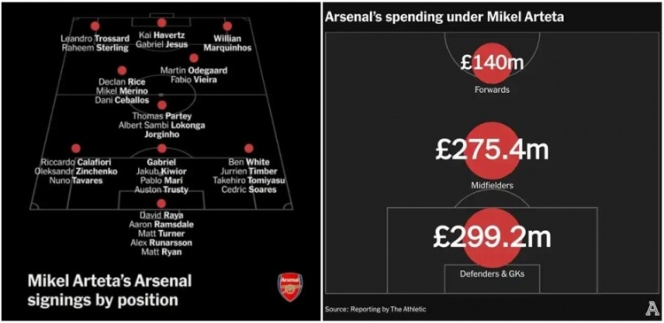 基于温格和埃梅里时代的教训,阿尔特塔认为阿森纳要想回归争冠集团,必须首先改变遇强则溃的气质,提升防线的抗击打能力就是关键。过去六个赛季,阿森纳的引援支出超过7亿英镑,近4成(2.99亿英镑)用来升级防线,中场新援身价总和约为2.75亿英镑,锋线的引援开支约为1.4亿英镑,占比仅20%,边锋位置的引援投入几乎可以忽略不计。